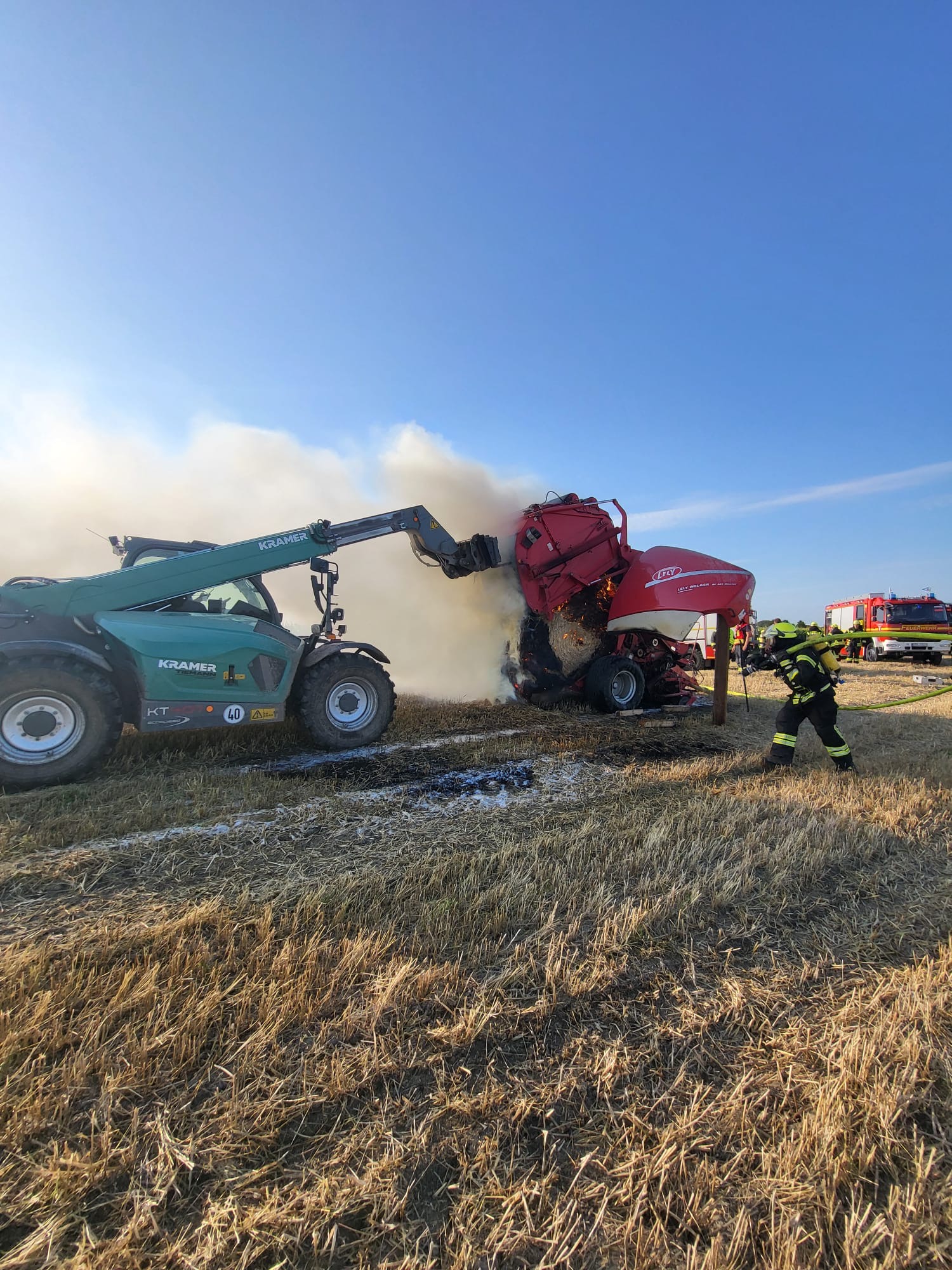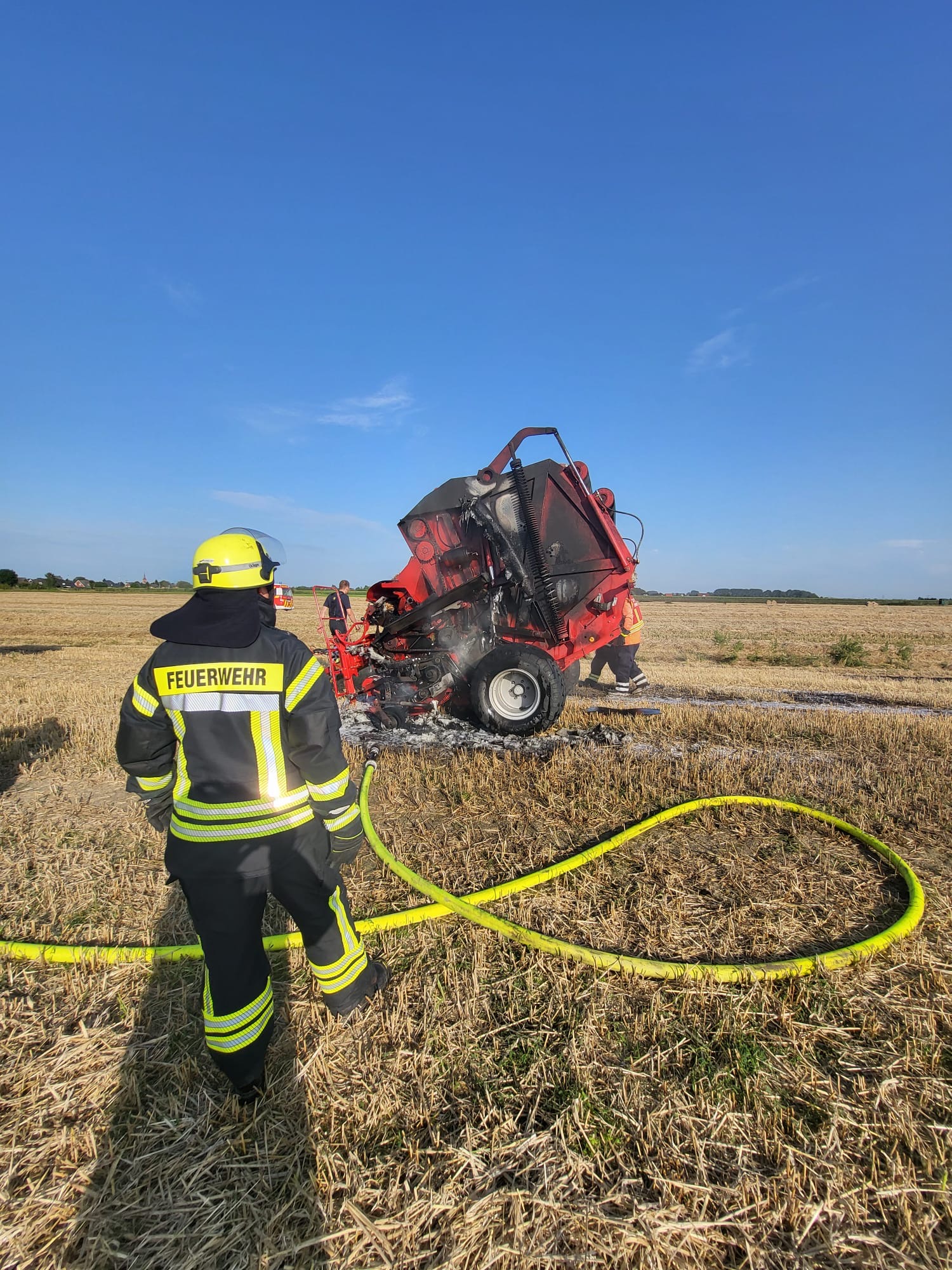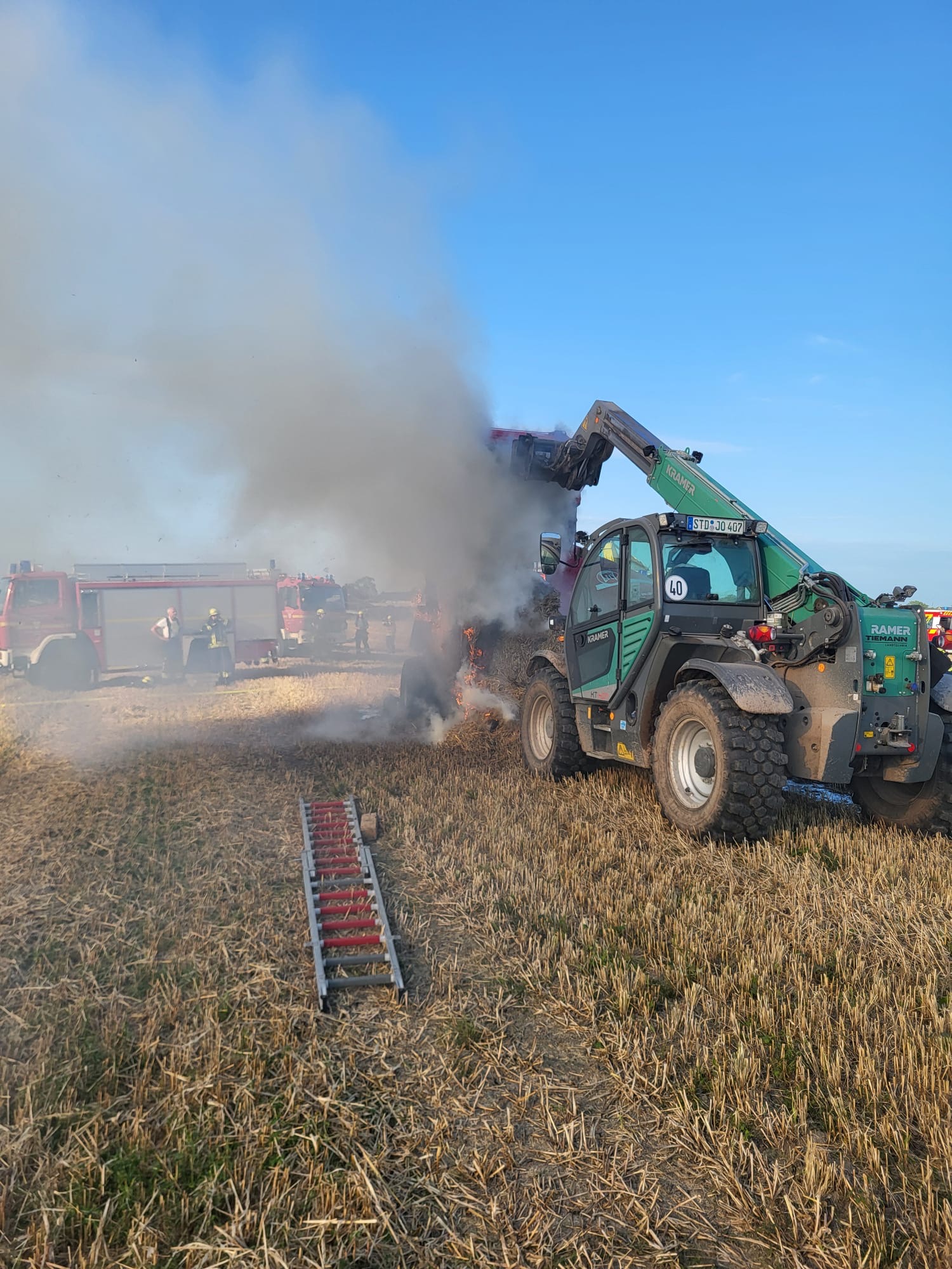 Kurz vor 18 Uhr wurden wir mit den Feuerwehren aus Asselermoor, Drochtersen, und Hüll zu einem Brandeinsatz alarmiert. Eine Strohballenpresse , Strohballen und Vegetationsflächen waren brennend gemeldet. Unter Atemschutz wurde das Feuer schnell gelöscht. Mit Hilfe eines Baggers und Teleskopladers konnte die Klappe der Rundballenpresse zum Löschen sicher fixiert werden. (REv)