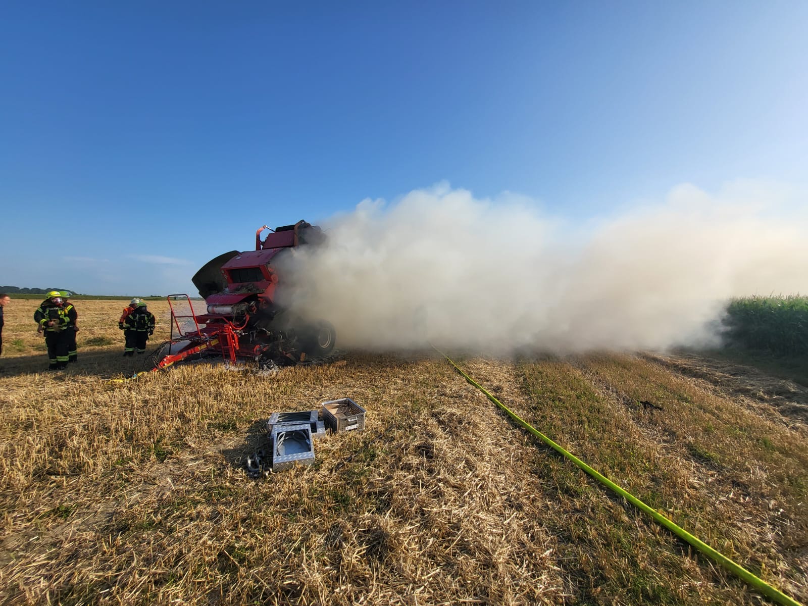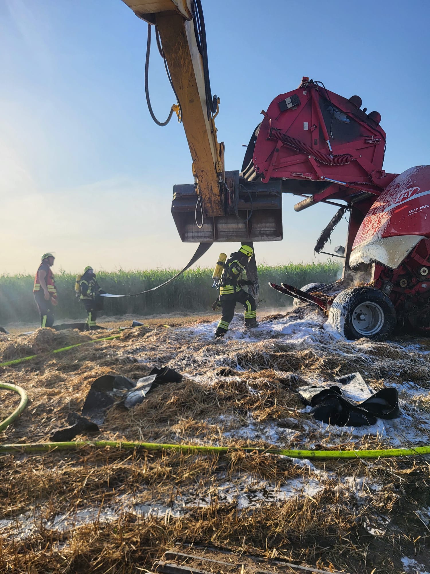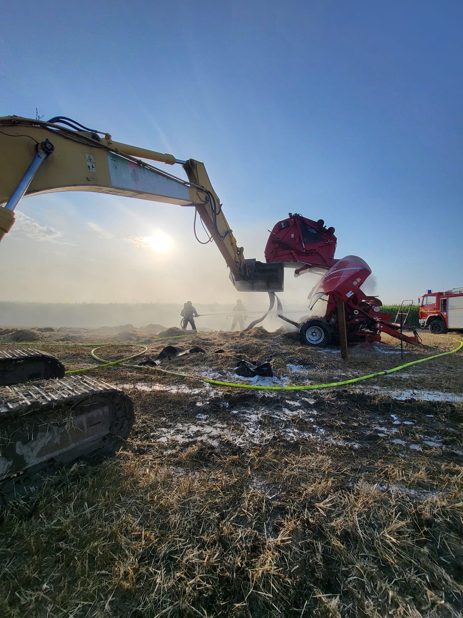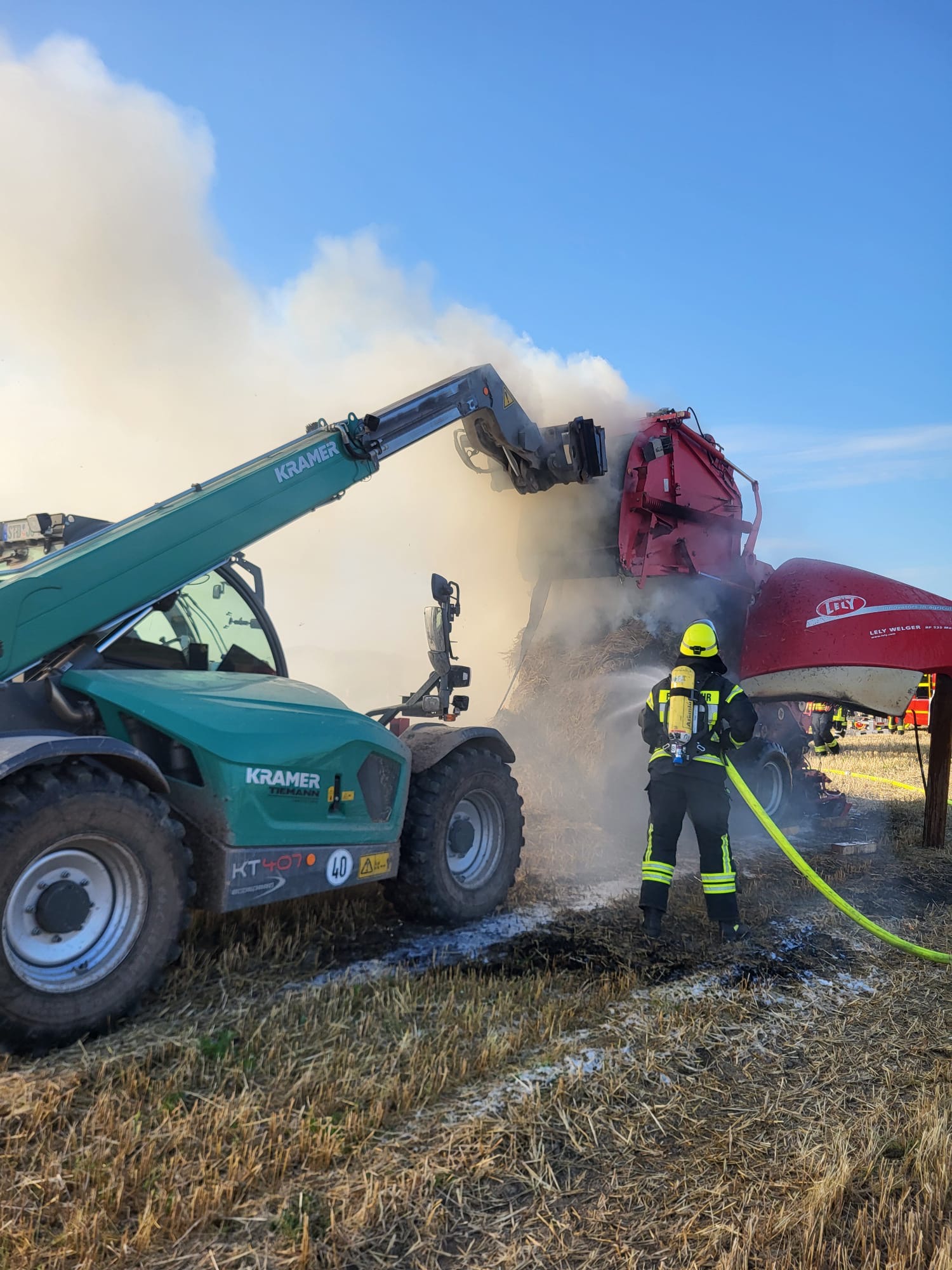 Kurz vor 18 Uhr wurden wir mit den Feuerwehren aus Asselermoor, Drochtersen, und Hüll zu einem Brandeinsatz alarmiert. Eine Strohballenpresse , Strohballen und Vegetationsflächen waren brennend gemeldet. Unter Atemschutz wurde das Feuer schnell gelöscht. Mit Hilfe eines Baggers und Teleskopladers konnte die Klappe der Rundballenpresse zum Löschen sicher fixiert werden. (REv)